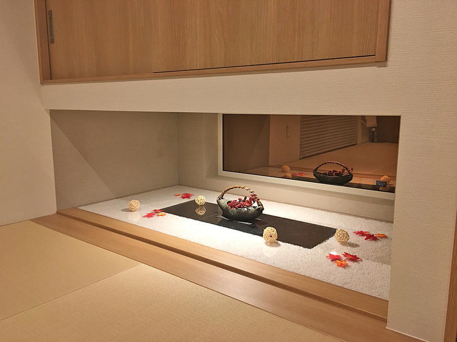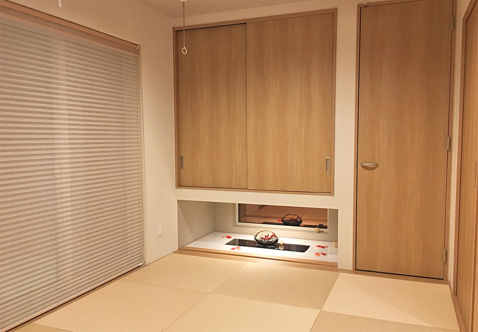 日常を豊かにする吊押入のある和室。造り付け家具により見えない収納を実現した家。