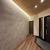 木のぬくもり、タイルの質感、照明デザインで落ち着きのある家