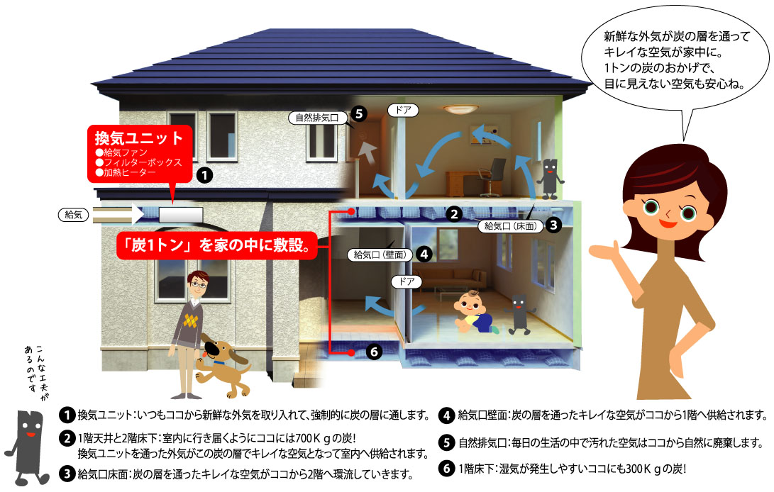 「炭の家」は、1階床下に300kg、1階天井に700kg、合わせて1トンもの炭を敷設