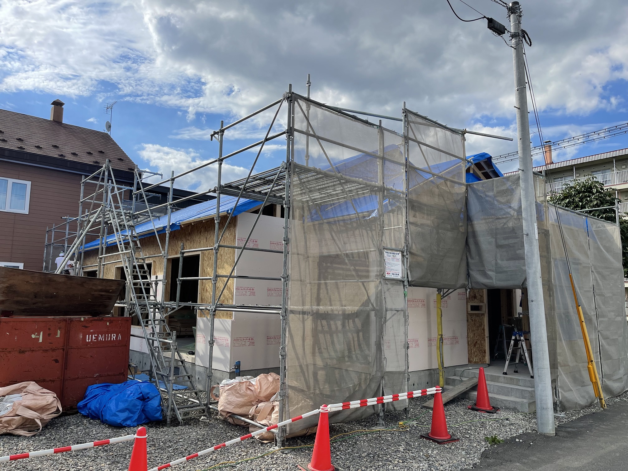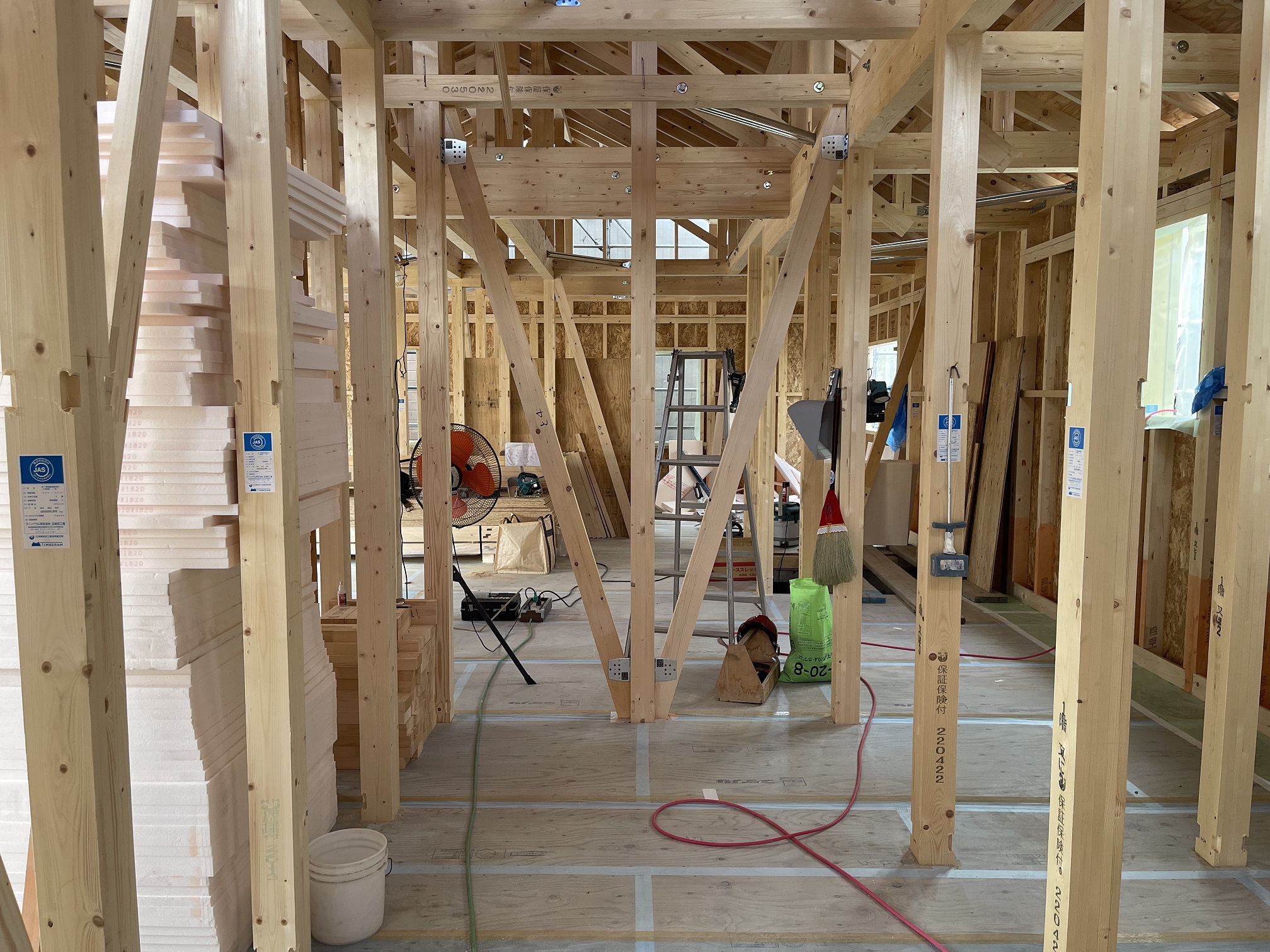 写真の左側にこれから施工する断熱材が山積みになっていますね。