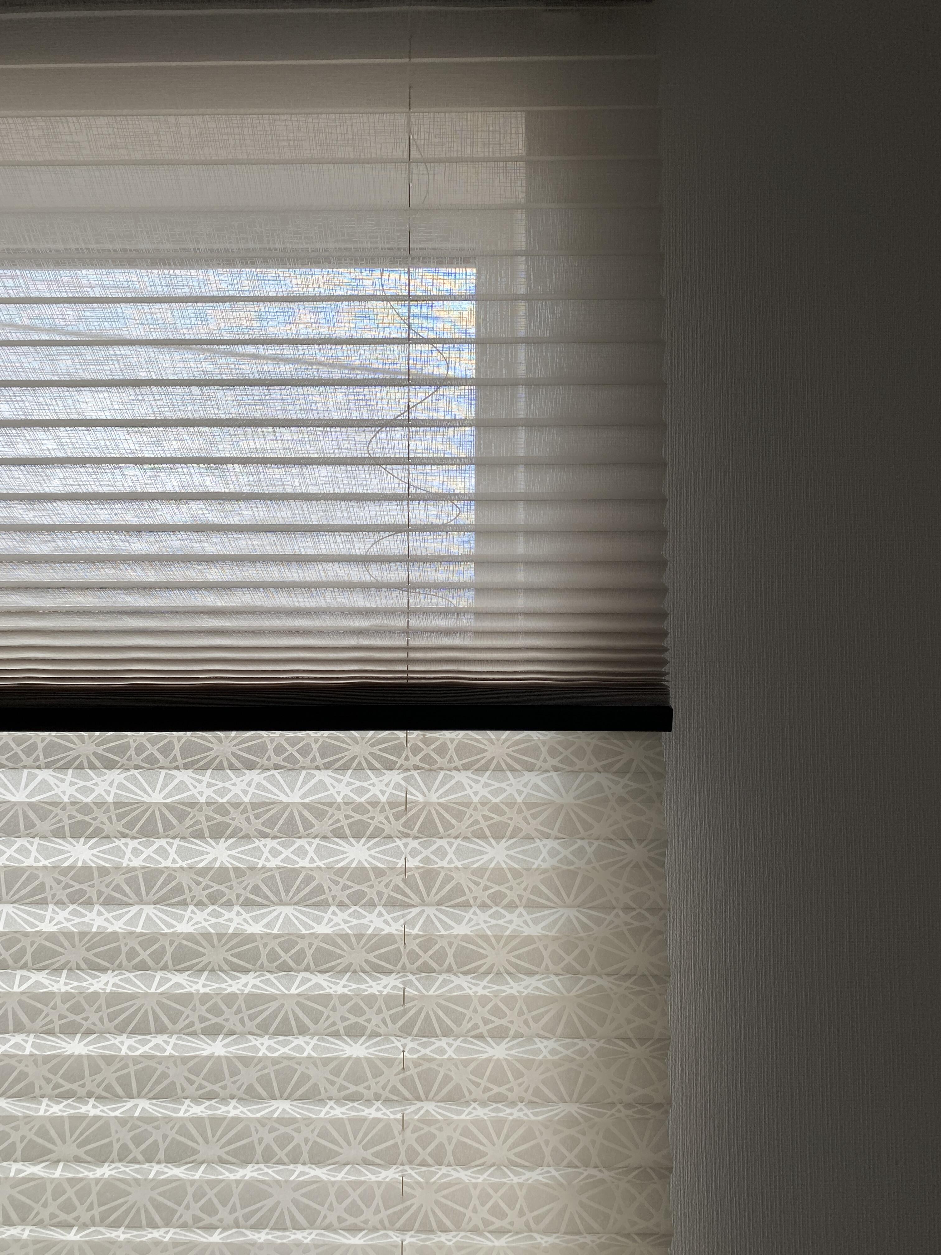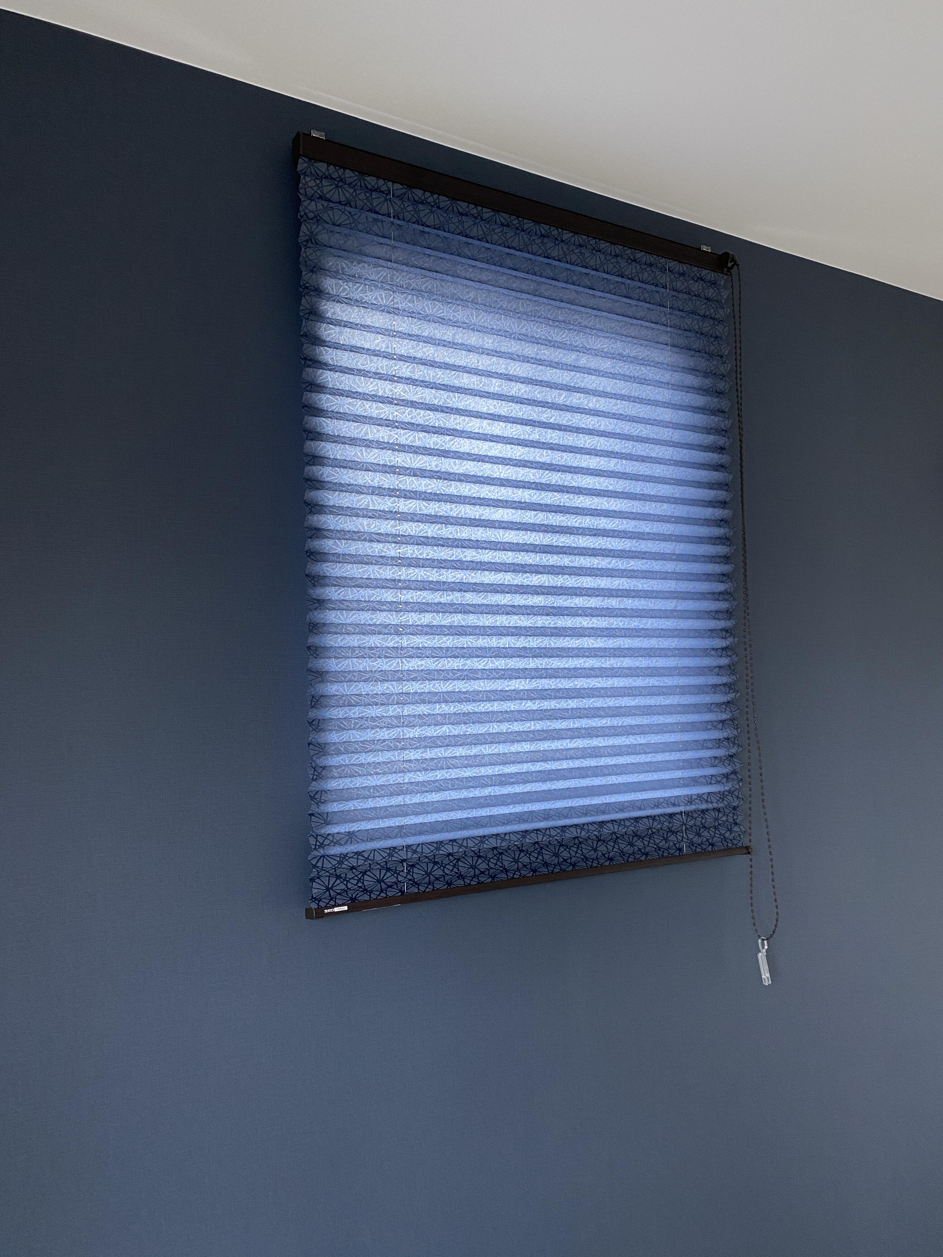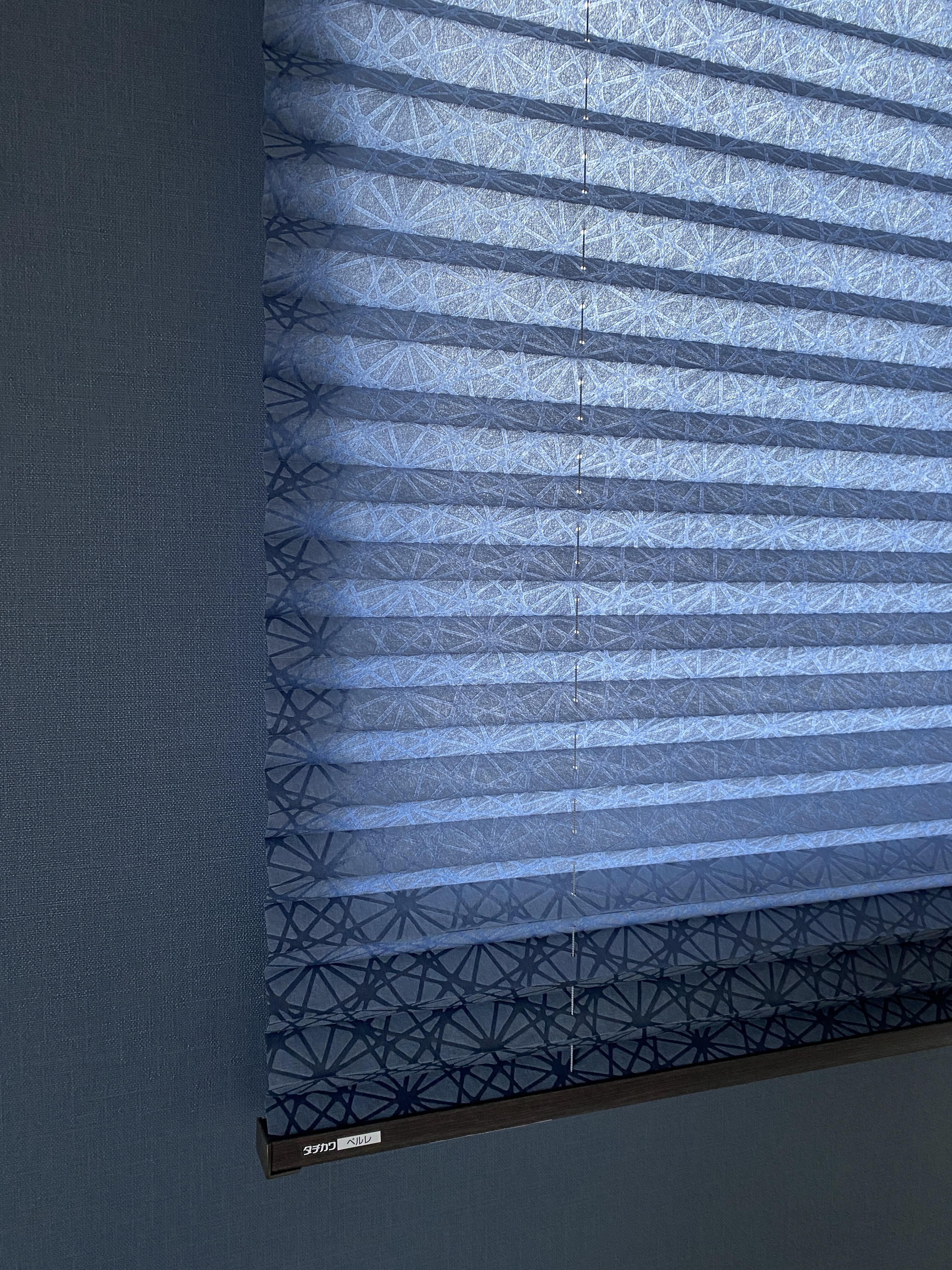 こちらのプリーツスクリーン、タチカワブラインドさんのハナカゴ。色はアイズミ。