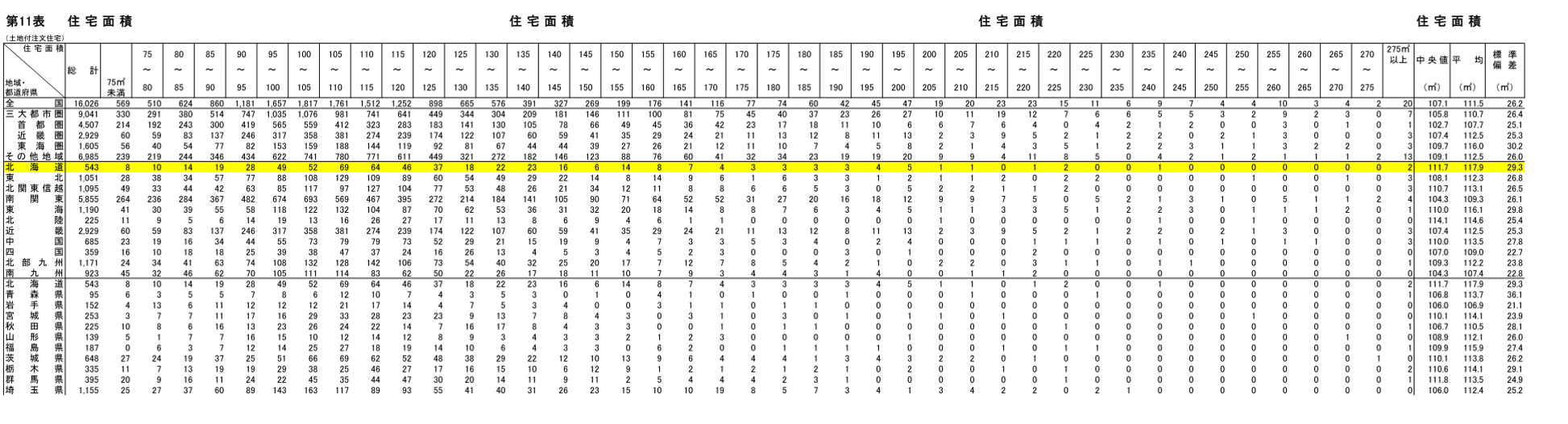 「第11表 住宅面積」より北海道の中央値が111.7㎡ 約33.78坪です。