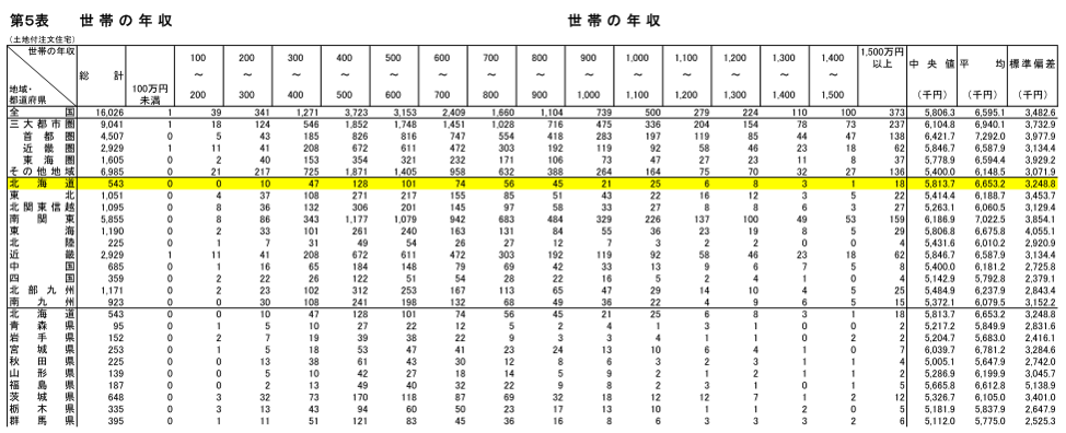「第5表 世帯の年収」より北海道中央値が581万円(「第6表 本人の年収」よりご主人様466万円 これにより奥様115万円とする)