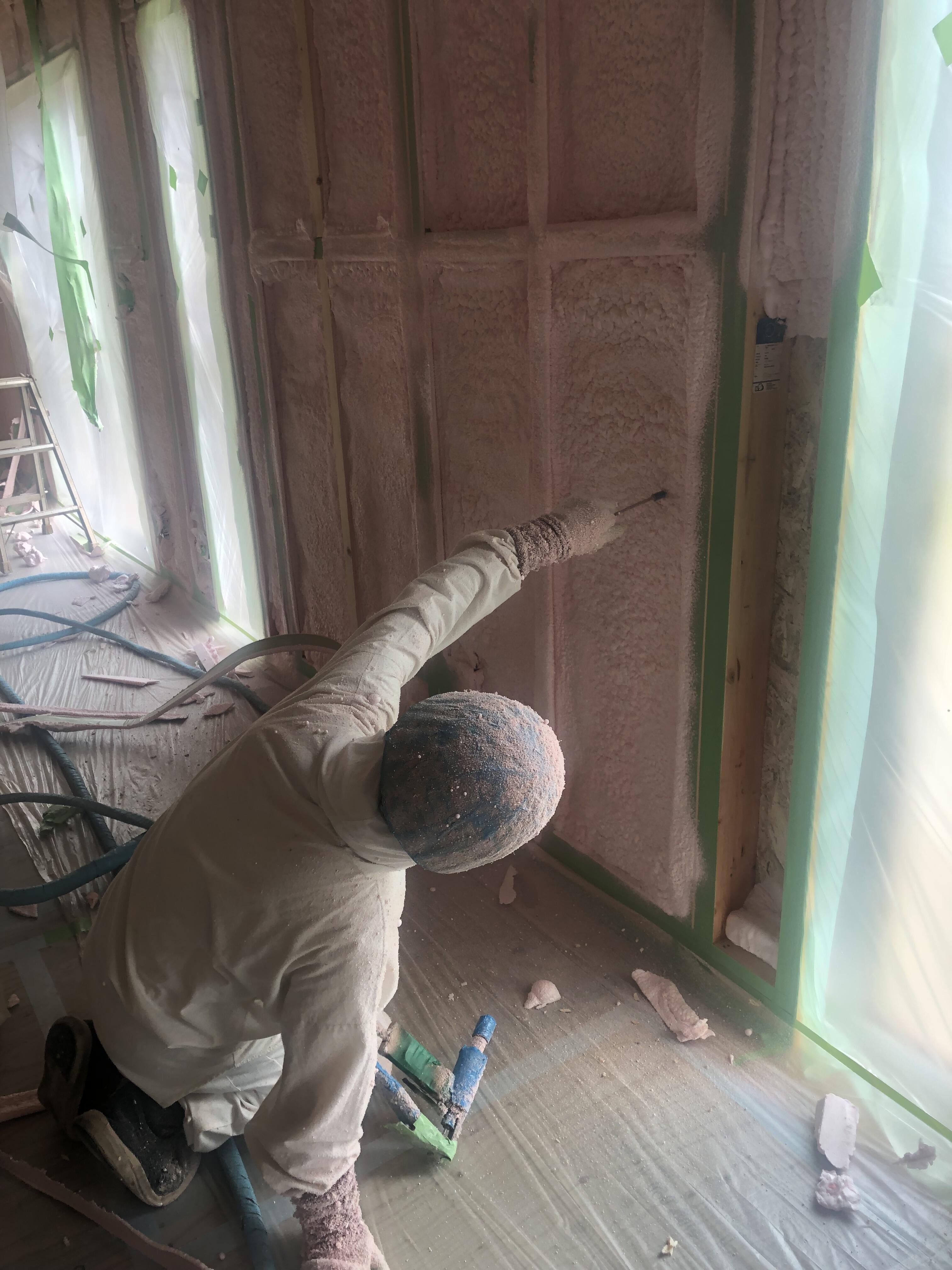職人さんに跳ね返ったウレタンが付着しています