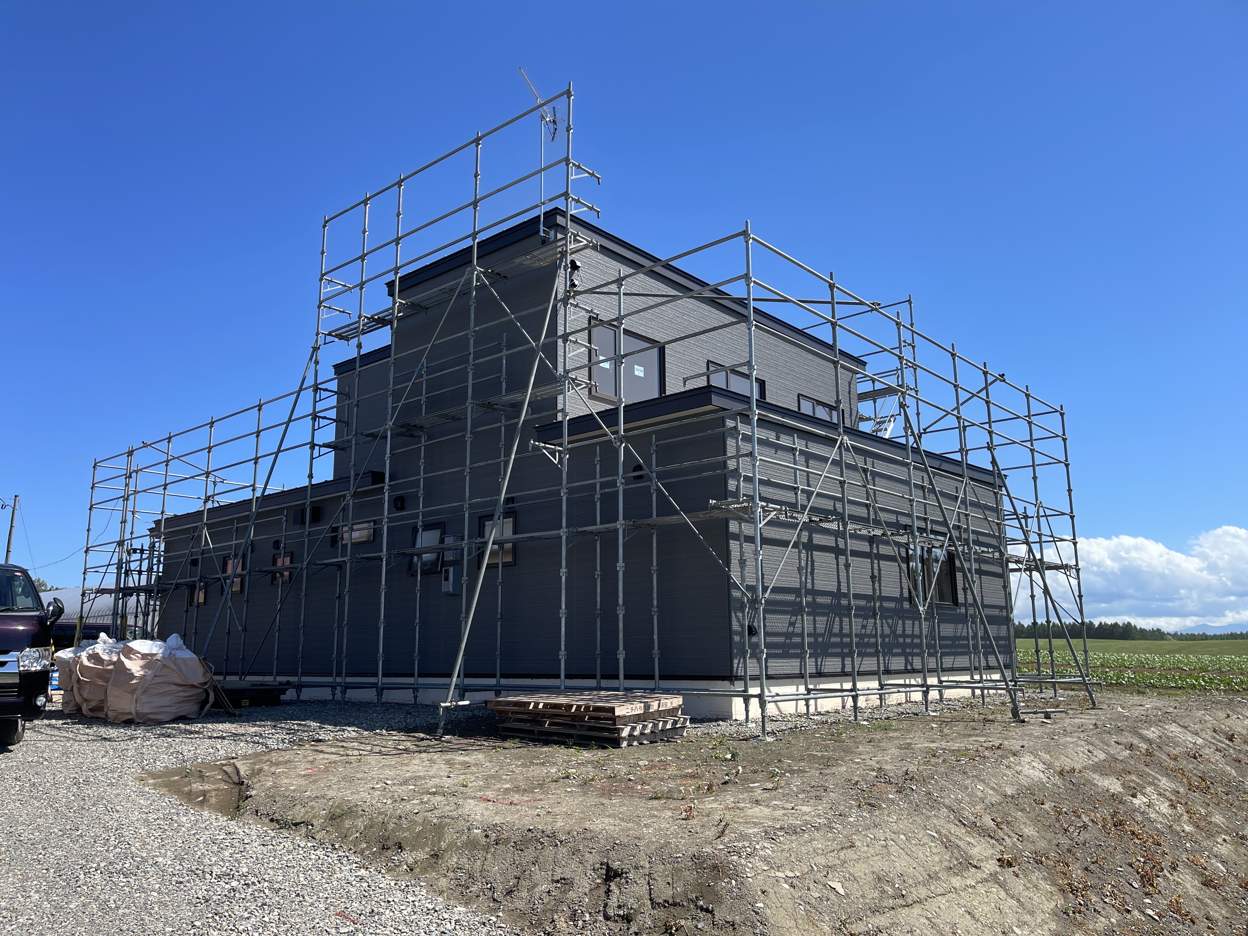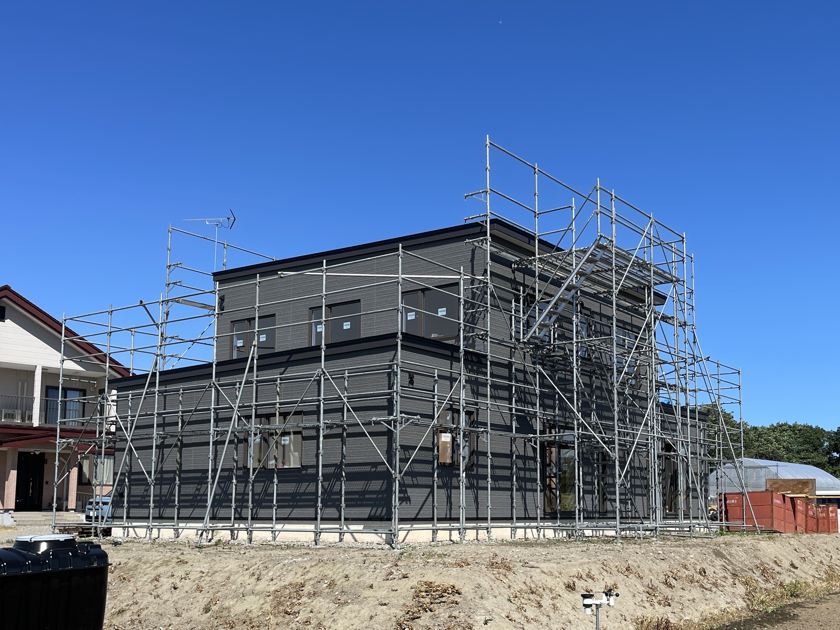 外壁が張られ外観は基礎断熱材のモルタル施工が