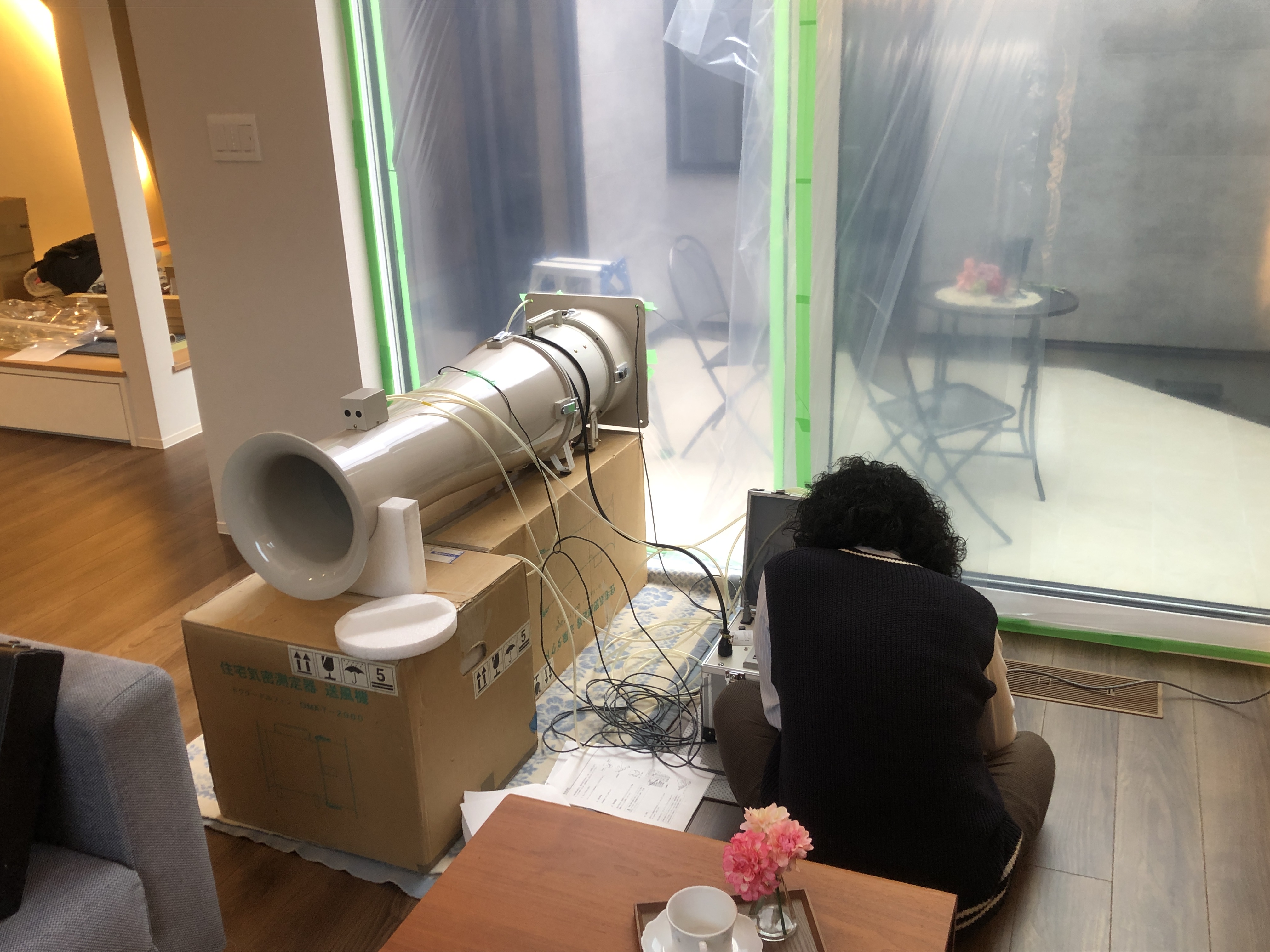 今回は【柏林台モデルハウス】の気密測定の様子を説明させて頂きます。