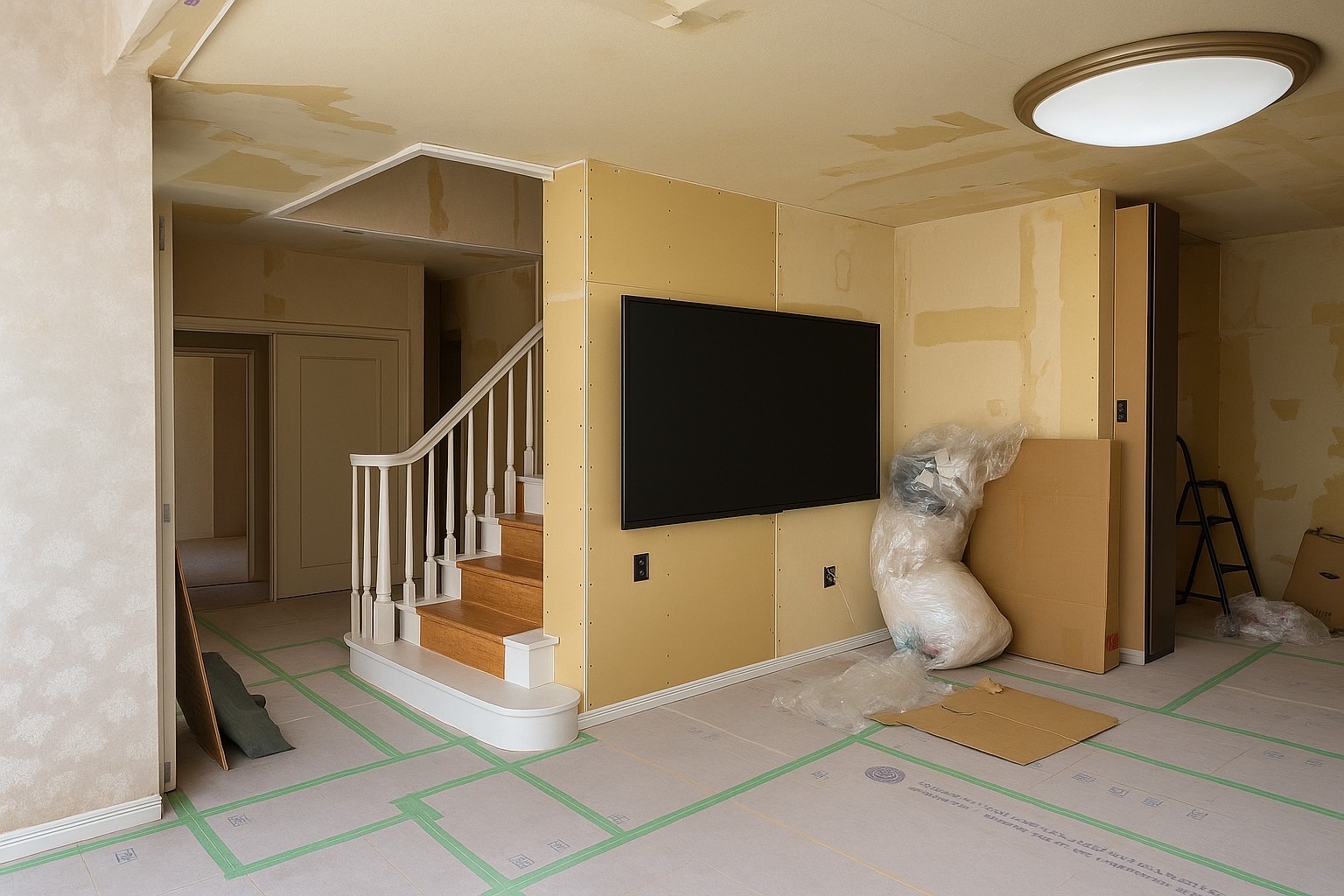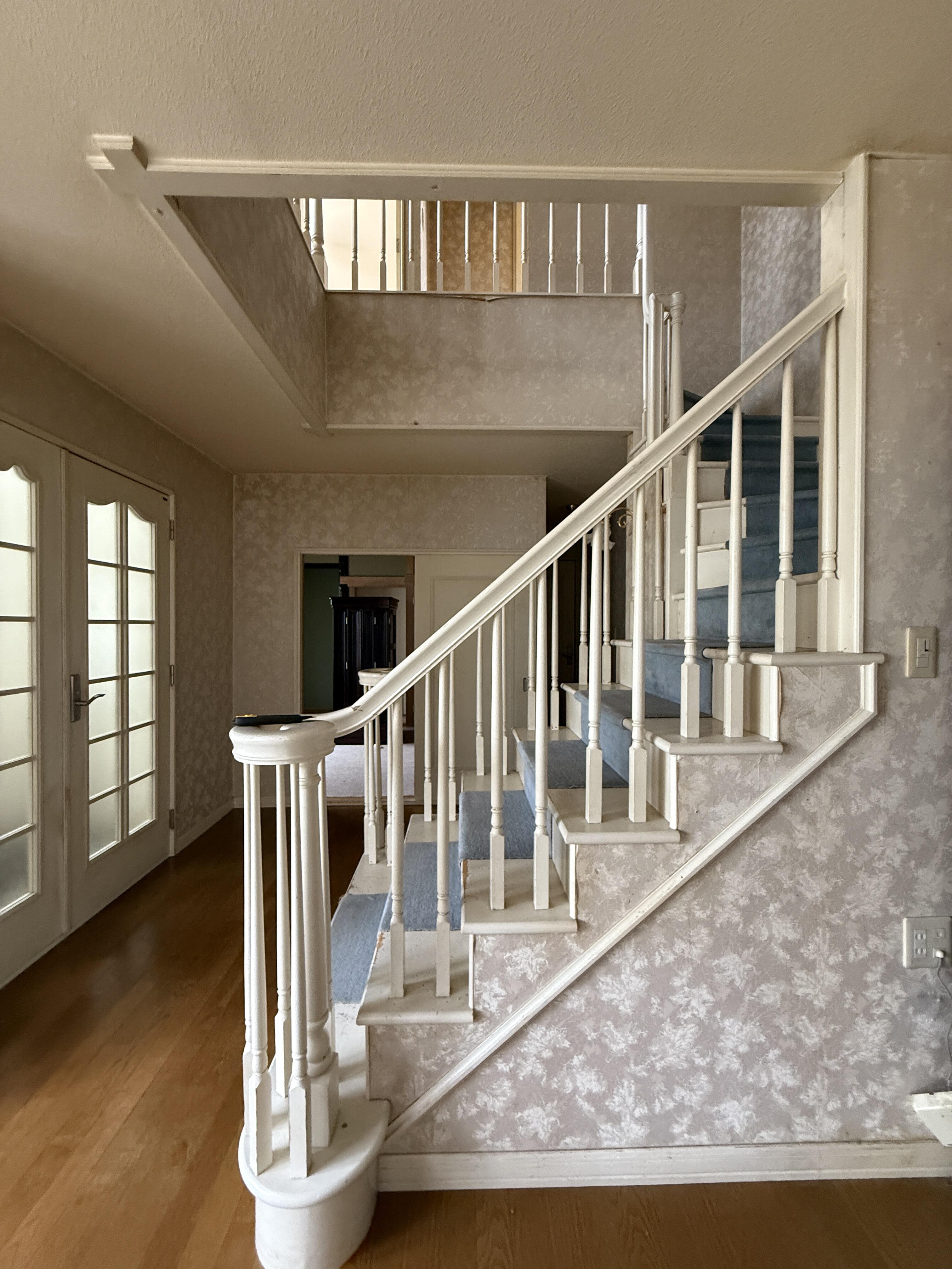 階段の手すりを取り、その壁に壁掛けTVを設置する予定です。